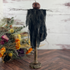 His clothing is made from painted and torn cheesecloth and fabric, and he's built upon a wooden dowel and an applewood slice that makes him very sturdy and versatile to display in many locations throughout your home.